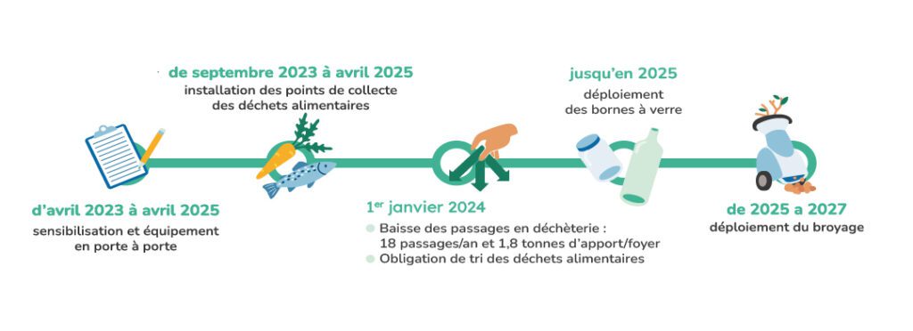 C’est déjà engagé depuis le 1ᵉʳ janvier 2023 par le tri de tous les emballages et des papiers ; depuis le mois de mai et jusqu’en 2025 avec la sensibilisation progressive des habitants à la valorisation des déchets alimentaires. Et jusqu’à fin 2027, d’autres actions viendront compléter le dispositif.