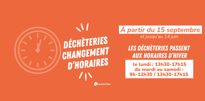 À partir du 15 septembre et jusqu’au 14 juin, vos déchèteries passent à de nouveaux horaires :